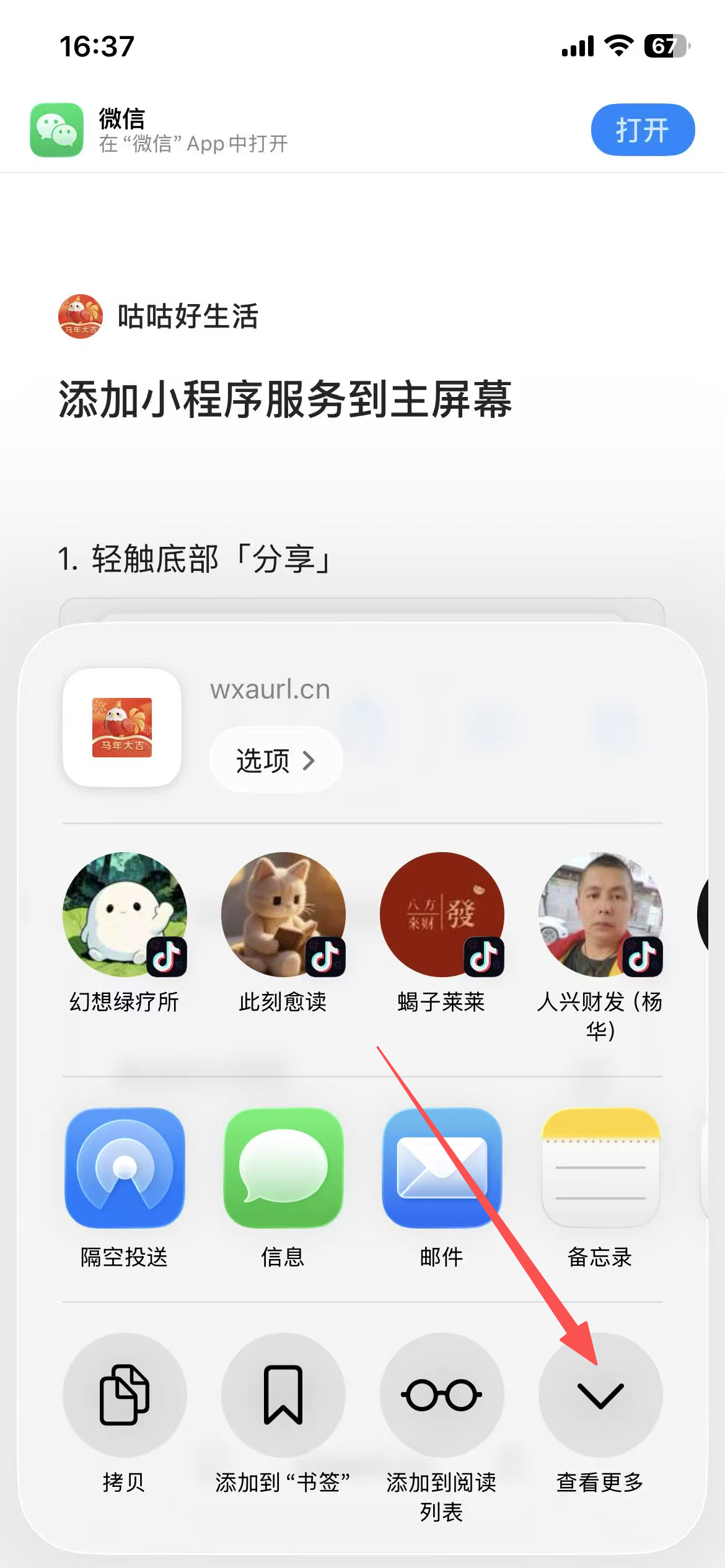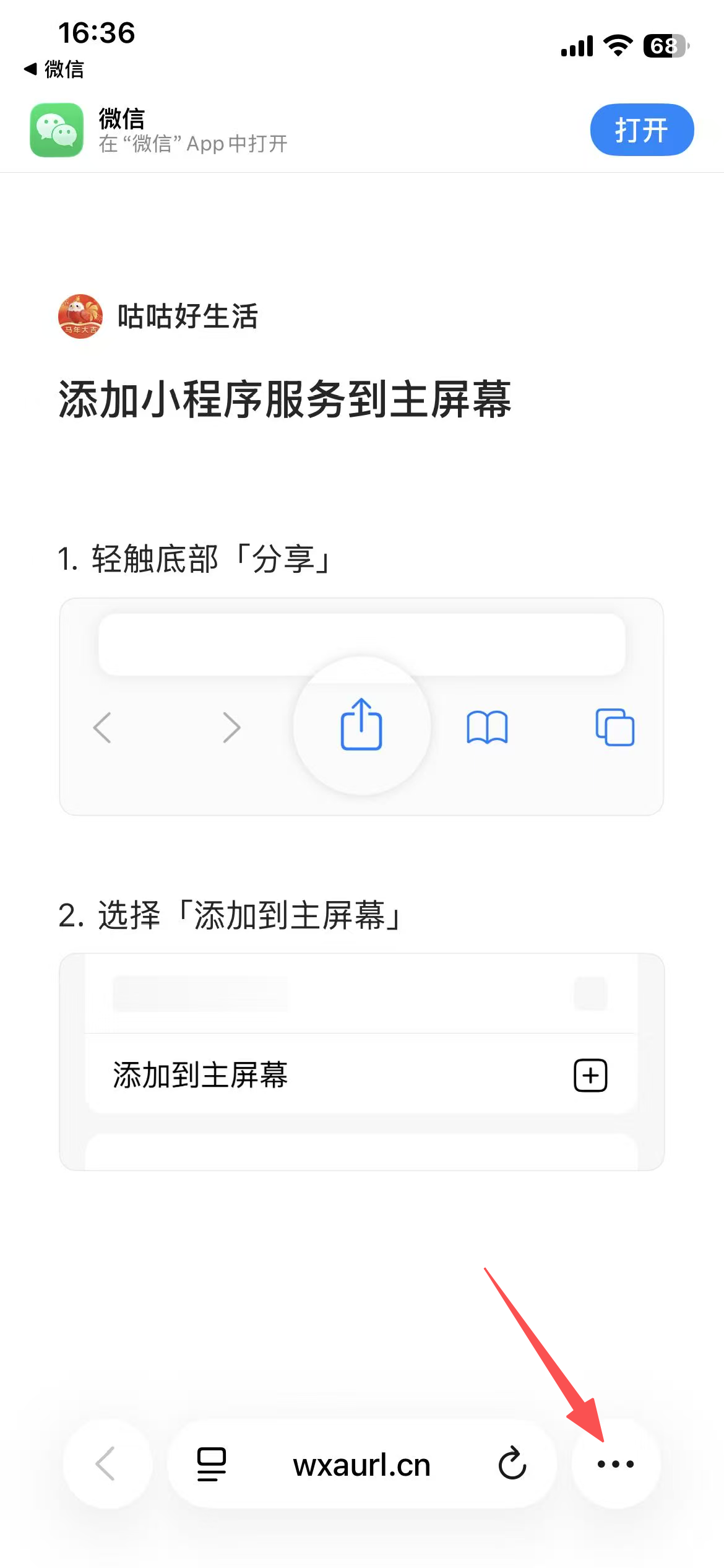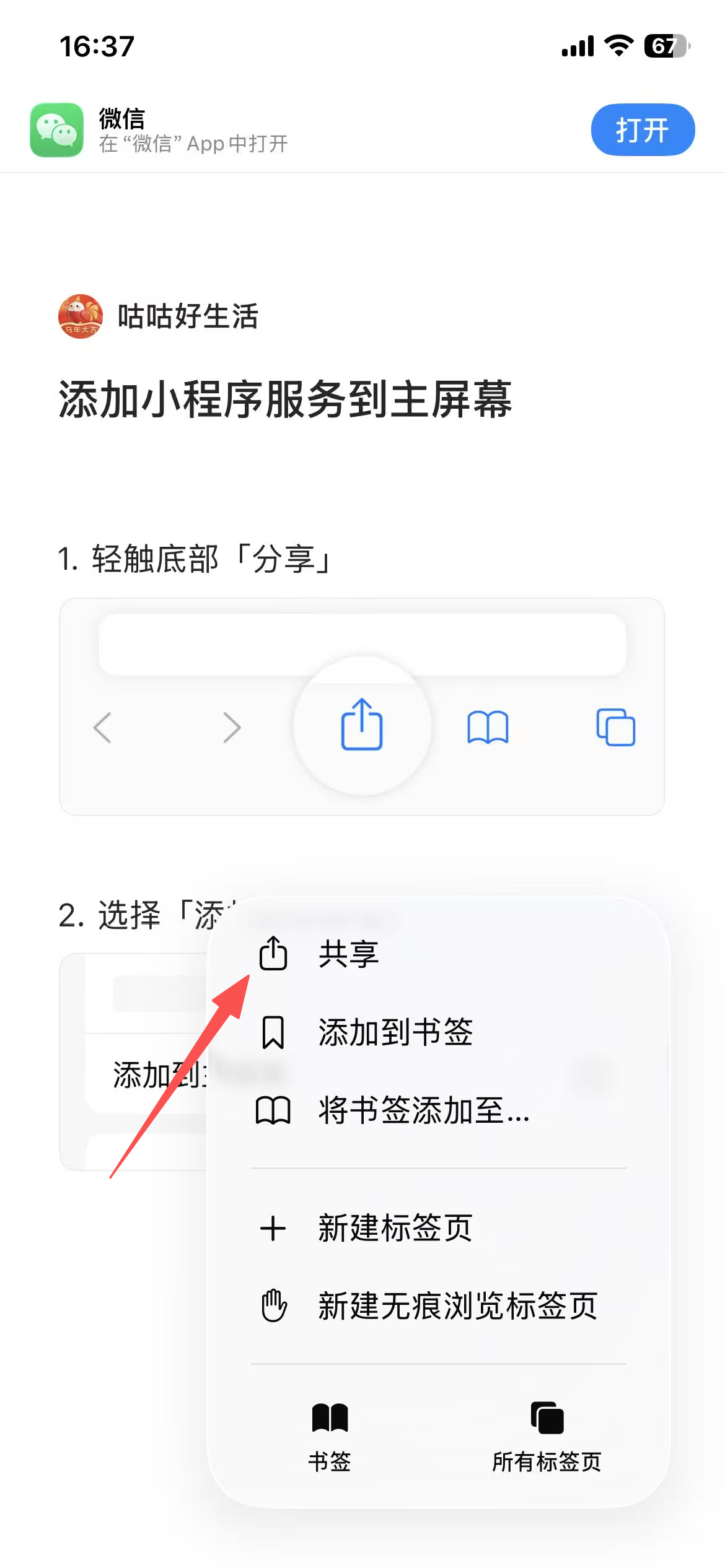 5️⃣ 自动跳转到浏览器后点击底部中间的 分享按钮(方框 + 向上箭头 ⬆️)
